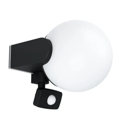 The outdoor light fixture is crafted in black cast aluminium and is equipped with a lampshade in the shape of a light ball made of white plastic The switch-on sensitivity of the built-in light-dark sensor can be individually adjusted from 2 to 2000 lux. The motion detector has a detection angle of 120°, the range is up to 5 m (16’4) Depending on your individual setting, the outdoor lamp stays on between 5 seconds and 10 minutes once the movement has been detected. The water-resistant outside door light is splash-proof (IP44). This allows for care-free use in outdoor areas, e.g. on the patio, garage, balcony or entrance areas The light bulb is not included in the scope of delivery. This front door light is suited to any type of light bulb with E27 holder, maximum wattage 15 W per socket Dimensions : height : 17 cm/ 6.7 inches, length : 17,2 cm/ 6.8 inches, projection : 19,7 cm/7.8 inches