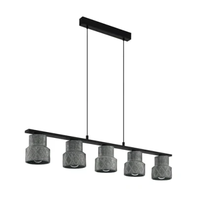 The decorative pendant light made of black steel with galvanized lampshades in a beaten metal look and a geometric pattern fits seamlessly into trends such as vintage and industrial No light bulb included in the delivery; The filament LED bulb is available separately under EGLO 110001 Dimensions: Height: max 150 cm, Length: 116 cm, Width: 14.5 cm