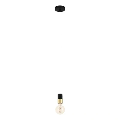 Thanks to its cylindrical lamp holder made of black steel with a decorative element in brass finish and its round black metal canopy, the pendant ceiling light fixture blends superbly with interiors in vintage and retro design The light bulb is not included in the scope of delivery; The depicted light bulb is available separately (product EGLO 12696) Dimensions: height: 150 cm/ 59 in, diameter: 4.5 cm/ 1.8 in
