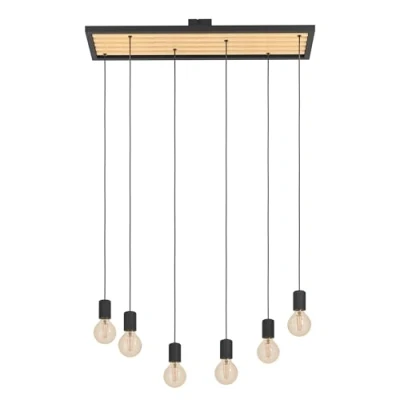 The pendant ceiling light fixture features a rectangular black metal frame mount with FSC approved rubberwood beams arranged lengthways and six black metal lamp holders that hang at different heights With a length of 78 cm, the pendant luminaire will create an eye-catching feature above the table in the dining room or in a living room Dimensions: length: 78 cm/ 30.7 in, width: 25 cm/ 9.8 in, height: 110 cm/ 43.3 in
