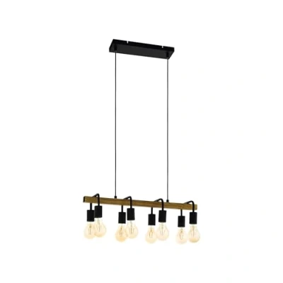 The living room hanging lamp combines an elongated metal rod in a rustic oak look with eight black, curved E27 sockets and industrial-style textile cables Pendant light fixture in a stylish vintage design for indoor use in living rooms, kitchens or dining rooms above an elongated dining table Dimensions: Length: 64.5 cm, width: 22 cm, height: 110 cm