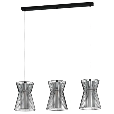 The cluster pendant light fixture with ist three lampshades made of black wire, its black and transparent smoked glass cylinders on the inside and its black fabric cables harmonizes with modern interiors The suspended luminaire with its appealing design scatters the light brightly throughout the room, whether it be in the living room or in the dining room above the dining table Dimensions: height: 110 cm/ 43.3 inches, length lamp canopy: 77 cm/ 30.3 inches, total length: 92.5 cm/ 36.4 inches, width: 22.5 cm/ 8.9 inches