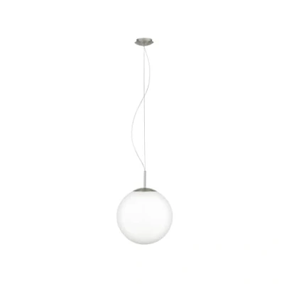 The dining room hanging lamp in matt nickel steel has a spherical glass lampshade made of matt opal glass, which provides even and glare-free lighting; thanks to its simple design, the light fixture can be combined with almost any décor No light bulb included; suitable for any light bulb with an E27 socket, maximum wattage per socket 60 W; dimmable depending on the light bulb used Dimensions: Height: 239.5 cm, diameter: 35 cm