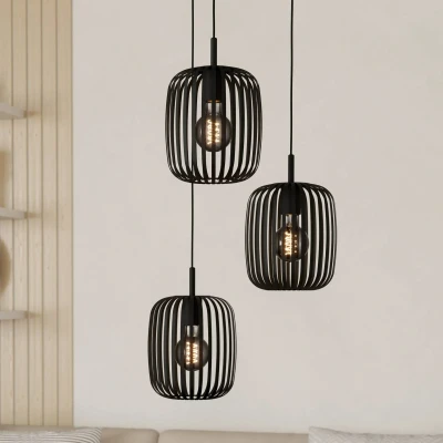 AmazonThe pendant light fixture features three round lampshades made of black flat metal strips; The shades are suspended at different heights with black textile cables from a round ceiling canopy Thanks to its soft balloon-shaped lampshades, the ceiling lamp complements modern interior design; It provides pleasant lighting for your living space, whether it be in the living room, bedroom, and above your dining table in the dining room Dimensions: height: 110 cm/ 43.31 in, diameter: 46 cm/ 18.11 in