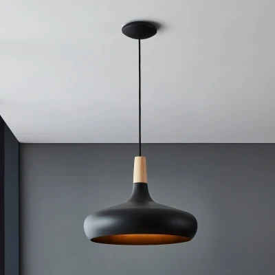 AmazonThe pendant ceiling light fixture features a curved black metal lampshade suspended on a black cable; The lampshade has a brown wooden element that complements the light’s distinctive charm The light bulb is not included in the scope of delivery Dimensions: diameter: 40 cm/ 15.7 in/ 15.7 in, height: 110 cm/ 43.3 in
