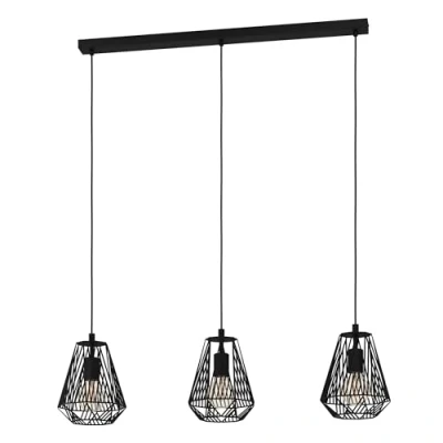 Amazon MarketplaceThe pendant light fixture made of black metal is equipped with three diamond-shaped wire lampshades and textile cables and fits seamlessly into the modern trend The suspended luminaire with its appealing design particularly catches the eye and is a highlight in any room – whether it be in the living room or in the dining room above the dining table Dimensions: height: 110 cm/ 43.3 inches, length: 96 cm/ 37.8 inches, width: 20 cm/ 7.9 inches
