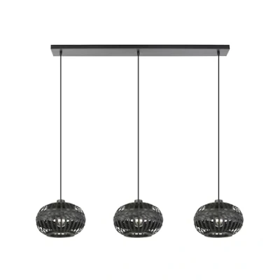 The hanging living room lamp combines an elongated black metal canopy with three woven black bamboo lampshades for a natural boho and Scandinavian look The pendant light fixture provides special lighting for any living space – whether in the living room, bedroom, dining room above the dining table or in the kitchen above the kitchen island Dimensions of the dining room lamp: Height: 123 cm, length: 112 cm, width: 26 cm