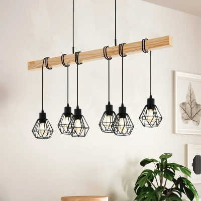 Eglo Pendant Lighting Townshend 5, 6 Light Vintage Hanging lamp in Industrial Design, Retro Ceiling Made of Black Metal and Natural Wood, FSC Certified, E27