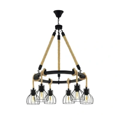 Lights.coPendant lamp Rampside in black and brown This pendant luminaire with its harmonious material mix of steel and wood is an eye-catcher in any room. The design of the lamp shows industrial chic in a high-quality finish. The colours black and the natural brown of the ropes harmonise perfectly. The six black steel cage umbrellas are each knotted to a black steel ring on a rope. The frame is held by three thick ropes, all of which are supported by hooks. This gives the lamp its pendant dynamics.