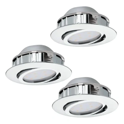The round LED recessed spotlights made of plastic in chrome colours can be swivelled and blend seamlessly into the modern trend The dimming function of the recessed light is possible with a matching rotary dimmer on the wall Thanks to the flat design and the timeless design, the LED spot can be used in any room - whether in the kitchen, living room, dining room, hallway or bedroom The energy-saving LEDs provide pleasant warm white light (each 3000 Kelvin, 6 Watt, max. 500 lumens). The LED bulb can be replaced if necessary; dimensions: installation depth: 4 cm, diameter: 8.4 cm, cut-out: 7.2 cm This product is an ambient product with an energy efficiency class G bulb, surrounding products are lights that can be disassembled for separate verification of the light source(s) contained This product is a containing product. Containing products are luminaires that can be disassembled for a separate check of the light source(s) they contain. This product contains a light source of energy efficiency class g