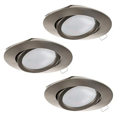 The round recessed spotlights in a set of 3 made of die-cast aluminium in matte nickel are adjustable and blend seamlessly into the modern trend The energy-saving LED bulbs are included in the delivery and provide a pleasantly warm white light (each 5 watts, 400 lumens) This product is an encompassing product with a light source of energy efficiency class F; encompassing products are luminaires that can be disassembled for separate inspection of the contained light source(s)