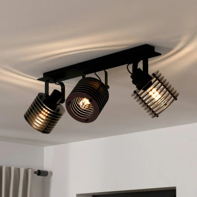 AmazonThe ceiling light fitting features a black metal ceiling canopy and three movable spotlights, making it an excellent match for industrial-style interiors Thanks to its black wooden slats, the ceiling spot creates a fascinating interplay of lights and shadow Dimensions: length: 57.5 cm/ 22.64 in, height: 18.5 cm/ 7.28 in, projection: 17.5 cm/ 6.89 in