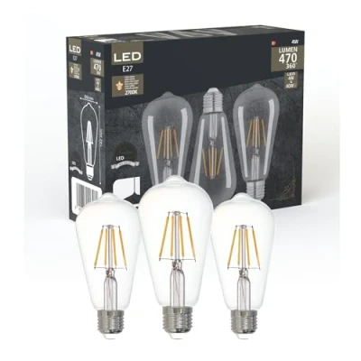 This set consists of 3 E27 filament LED bulbs made of transparent glass in ST64 bulb shape, which give your rooms a warm, nostalgic flair The bulbs fit into any standard E27 lamp socket and are ready for immediate use - ideal for quickly replacing old bulbs or for new installations in decorative luminaires Dimensions: Length: 14.2 cm, diameter: 6.4 cm