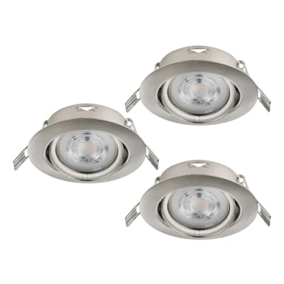 The three recessed lights made of matt nickel steel are adjustable and, thanks to the flat GU10 bulbs (EGLO 110351), can be used flexibly even with a shallow installation depth of 6.5 cm With 4 watts of power each, 400 lumens, and a warm white light colour of 2700 Kelvin, each LED spot with GU10 socket provides comfortable light for a cosy atmosphere This product is an containing product with a light source of energy efficiency class E; containing products are luminaires that can be disassembled for separate inspection of the contained light source(s)