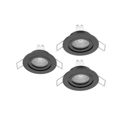 The three round recessed lights made of black plastic are equipped with GU10 bulbs and can be easily installed in suspended ceilings with 6.4–6.8 cm ceiling cutouts thanks to the clamps The recessed spotlights provide 345 lumens each at 4.5 watts and deliver warm white light at 3000 kelvin for comfortable and functional illumination This product is a containing product with a light source of energy efficiency class F; Containing products are luminaires that can be disassembled for separate inspection of the contained light source(s)