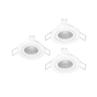 The three round recessed lights made of white plastic are equipped with GU10 bulbs and can be easily installed in suspended ceilings with 6.4–6.8 cm ceiling cutouts thanks to the clamps The recessed spotlights provide 345 lumens each at 4.5 watts and deliver bright, functional lighting with their neutral white light (4000 Kelvin) in bathrooms or work areas This product is an containing product with a light source of energy efficiency class F; containing products are luminaires that can be disassembled for separate inspection of the contained light source(s)