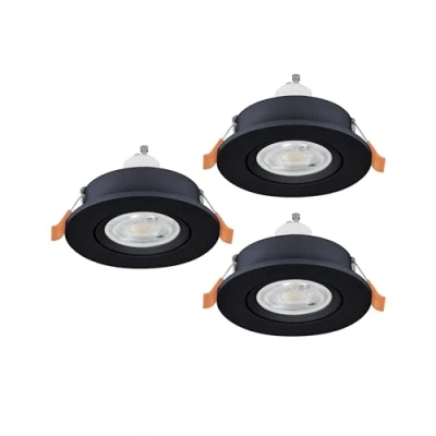 The three round recessed lights made of black plastic are equipped with GU10 bulbs and can be easily installed in suspended ceilings with 6.8–7.5 cm ceiling cutouts thanks to the clamps Thanks to their swivel mounts, the LED floodlights can be individually adjusted, allowing for flexible lighting design This product is a containing product with a light source of energy efficiency class F; Containing products are luminaires that can be disassembled for separate inspection of the contained light source(s)