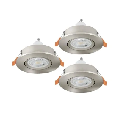The three round recessed lights made of silver-coloured plastic are equipped with GU10 bulbs and can be easily installed in suspended ceilings with 6.8–7.5 cm ceiling cutouts thanks to the clips Thanks to their adjustable mounts, the LED floodlights can be individually directed, allowing for flexible lighting design This product is a containing product with a light source of energy efficiency class F; Containing products are luminaires that can be disassembled for separate inspection of the contained light source(s)