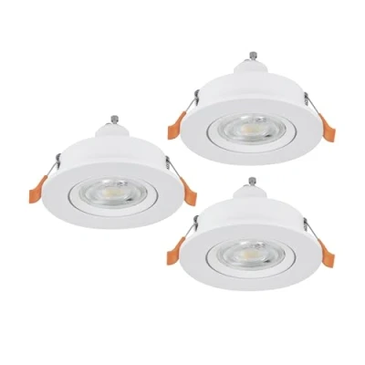 The three round recessed lights made of white plastic are equipped with GU10 bulbs and can be easily installed in suspended ceilings with 6.8–7.5 cm ceiling cutouts thanks to the clamps Thanks to their swivel mounts, the LED floodlights can be individually adjusted, allowing for flexible lighting design This product is an ambient product with a light source of energy efficiency class F; ambient products are luminaires that can be disassembled for separate inspection of the contained light source(s)