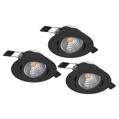This set of 3 round recessed spotlights made of black aluminium features adjustable spots for targeted light direction With 6 watts power per spot, 580 lumens and 4000 kelvin, the LED spots produce a neutral white light for bright and clear ceiling illumination This product is an enclosing product with a light source of energy efficiency class E; enclosing products are luminaires that can be disassembled for separate inspection of the contained light source(s)
