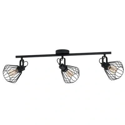 The decorative ceiling light made of steel in black with three spotlights made from a wire frame blends seamlessly into trends such as vintage, industrial and modern When the spotlights are switched on, the lampshades create a fascinating combination of light and shadow With its design, the ceiling light offers a highlight in any room – whether in the kitchen, living room, dining room, hallway or bedroom No bulbs included; the filament LED bulbs are available separately under Eglo 110012; suitable for any bulb with E27 socket, maximum 40 watts per socket; dimmable depending on the bulb used Dimensions: length 77.5 cm, width 11 cm