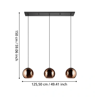 Lights.coCordoba hanging light: elegance and versatility for stylish interiors The Cordoba hanging light in a long shape with three copper-coloured vapour-coated glass lampshades in a spherical shape combines modern design with high-quality materials and fits perfectly above a long dining table. When the light is switched on, the bulbs in the lampshades are visible, which further enhances the beautiful appearance of the light. For this reason, filament bulbs should be used. Equipped with dimmable bulbs, the light can be dimmed using an external dimmer. With its elongated shape and elegant appearance, the Cordoba hanging light is not only a functional lighting element, but also a decorative highlight in the room.