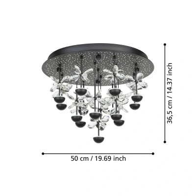 Lights.coPianopoli LED ceiling light with glass elements that sparkle in the light The Pianopoli LED ceiling light captivates with its dazzling light effect, which is created by the illumination of numerous clear glass elements. The hemispherical steel elements, which are attached to the round canopy at different heights, contain warm white LEDs whose light shines upwards and illuminates the flower-like glass elements from below. The cut glass flowers shimmer and sparkle in the light, creating a beautiful ambience in any room. With its black colour scheme and clear crystal elements, the light becomes an eye-catcher in any room. The built-in LEDs are dimmable using an external dimmer.
