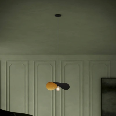 Saceda pendant light in elegant black/gold The Saceda pendant light combines beautiful design with a fascinating colour combination of black and gold. Its circular, curved lampshade is matt black on top and has a striking gold-coloured finish with a striking texture on the underside. The light fits very well over a table and emits a cosy light thanks to its golden surface. It looks particularly decorative when fitted with an LED globe bulb with filament technology. Made of high-quality steel, this light fits seamlessly into various living spaces such as dining rooms, living rooms and kitchens. Its clean lines and stylish colour scheme make it an eye-catching feature that adds a special touch to any room. With the use of a dimmable bulb, the light can also be dimmed via an external dimmer to adjust the light intensity and thus create different atmospheres. The Saceda pendant light is not only a functional lighting element, but also a stylish accessory that enriches the ambience of any room.