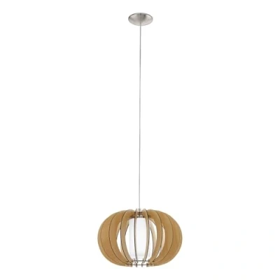 The decorative pendant light made of steel in matt nickel with a round lampshade made of wooden slats in maple colours and an inner glass body in white blends seamlessly into trends such as modern and vintage When the pendant lamp is switched on, the lampshade creates a fascinating interplay of light and shadow With its special design, the pendant lamp offers a highlight in any room - whether in the kitchen, in the living room or in the dining room above the dining table No bulb included; the bulbs shown are sold separately under EGLO 110032; suitable for any bulb with E27 socket, maximum 60 watts per socket; dimmable depending on the bulb used Dimensions: height: max. 130 cm, diameter: 40 cm