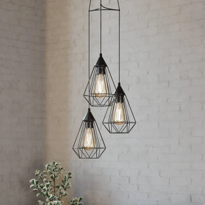 Three-bulb Tarbes pendant light in a vintage design The Tarbes pendant light sees three lampshades, each with an E27 socket and made from thin wire, hang down at different heights from the round canopy. The result is an extraordinary appearance that is both modern and rustic. The fact that the lampshades have an open design means that you have a clear view of the light bulb in places, so that it can really come into its own. As such, it is ideal if you combine the E27 sockets with globe lamps. These can be ordered from the Accessories section of the website, together with other suitable light bulbs.