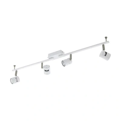 The LED ceiling light made of metal in white and matte nickel with four adjustable spotlights integrates well into modern interiors The subtle, side cut-outs skilfully complete the modern design of the ceiling lamp – whether in the kitchen, living room, hallway, or bedroom This product is a surrounding product with a light source of energy efficiency class F; surrounding products are luminaires that can be disassembled for separate inspection of the contained light source(s)