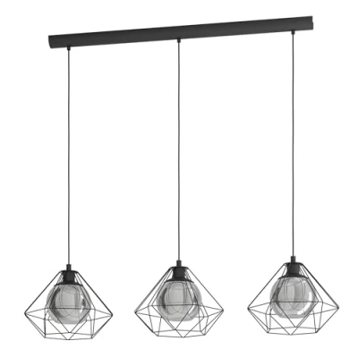 The decorative pendant light made of black steel with lampshades featuring a geometric wire frame and an inner sphere of black-transparent coated glass fits seamlessly into trends such as vintage, industrial and retro The pendant lamp features a distinctive design that adds a highlight to any room – whether in the kitchen, living room, or dining area above the dining table Dimensions: Height: max 110 cm, Length: 114.5 cm, Width: 32.5 cm
