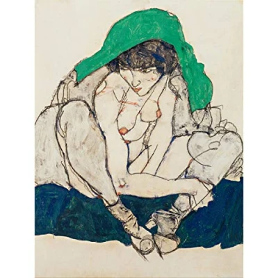 Egon Schiele hockende Frau mit grünem Kopftuch, großer Kunstdruck, Wanddekoration, hochwertiges Wandbild