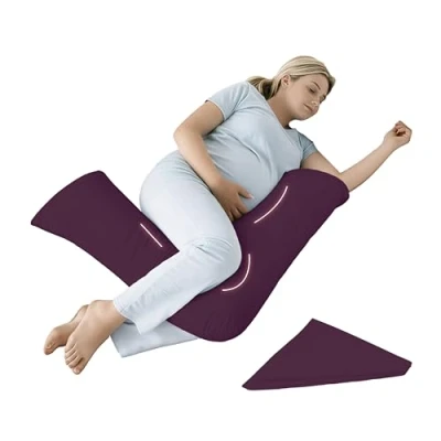 | PERFECT FIT & PRACTICAL SIZE - 1x v shaped pillow with plum pillowcase measuring approximately 70cm x 30cm – designed to sit comfortably on beds, sofas, or chairs. | ERGONOMIC FULL-BODY SUPPORT V SHAPED PILLOWS WITH PILLOWCASE - Designed to support the head, neck, back, and shoulders while maintaining proper alignment – helps reduce pressure, discomfort, and restlessness during sleep or rest. | BREATHABLE & ANTI-ALLERGY COTTON BLEND COVER - Soft cotton blend v shaped pillowcase promotes airflow while helping protect against dust mites and allergens – suitable for sensitive skin and everyday use. | VERSATILE SUPPORT FOR MULTIPLE USES - Ideal for pregnancy, nursing, post-surgery recovery, reading, lounging, or side-sleeping – this v pillows for adults provides stable support wherever extra comfort is needed. | EASY-CARE & BOUNCE-BACK COMFORT - Removable cover is machine washable at 40°C – pillow filling re-plumps easily to maintain shape and support with regular use.