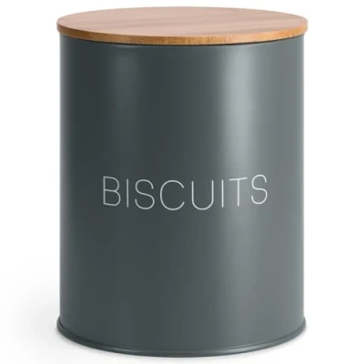 Durable Design - Designed from powder-coated metal in grey shade with wood lids. Our stylish, smart, and useful canisters will surely look attractive on your kitchen worktop. Use - High-quality jars are very versatile and can be used for biscuits, and cookies and even allows you to store a variety of food like nuts, flour, spices, tea, coffee beans, and more. You can also use them as a candy jar for storing sugar, and snacks. Airtight Wood Lid - Crafted from wood, the well-fitting airtight lids feature a silicone seal around the edge, not only keeping everything fresher for longer they will also lock in the flavor and aroma of your sweet treats. Care Instruction - Wash before first use. The canisters are easy to maintain, requiring just a simple wipe to clean to keep the quality finish or easy to wash by hand when required. Not dishwasher safe. Great Storage Solution - A fabulous way of storing your ingredients. Use different jars for different things at different times! Ideal for neat space-saving storage for storing your much-needed ingredients on your kitchen worktop. EHC Biscuit Storage Canister/Jar Measures - 17.5 cm High and 14 cm in Diameter., Weight: 450.0 grams, Manufacturer: Elite Housewares