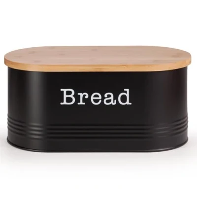 EHC Space Saving Extra Large Bread Box Bin With Wooden Lid For Kitchen Storage,Round Enamel Storage Canister Crock Jar Kitchen, Black