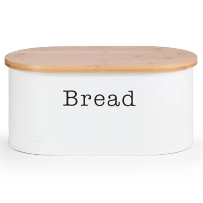EHC Space Saving Extra Large Bread Box Bin With Wooden Lid For Kitchen Storage,Round Enamel Storage Canister Crock Jar Kitchen, White