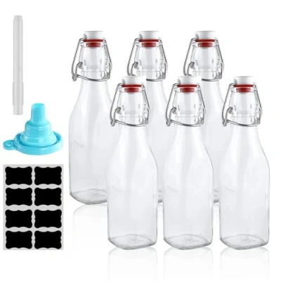 Clip Top Preserve Bottles - 250ml - Set of 6 Airtight Glass Cruet Dispenser Bottles, Ideal for Home Brewing, Vintage Style Vacuum Clip Seal, Glass Bottles w/Stoppers. Reusable And Easy To Clean - Our eco-friendly clip-top bottles can be used over and over again for a wide variety of beverages and condiments. Each bottle is leak-proof and dishwasher safe. Multi-Purpose Air Tight Bottles - These glass bottles with stoppers are ideal for homebrewing, wine making and pickling; containing cooking oils, dressings, sauces and vinegar, as well as drinks such as beer, juice, kombucha, soda, water, cider, eggnog, and tea. (Not suitable for boiled water) Premium Quality - Crafted with quality in mind, our thick and resilient glass bottles are thoughtfully designed for versatile use. Whether you need them for labeling and organizing your pantry, showcasing them as elegant home decor pieces, or presenting them as charming party favors, these bottles effortlessly fulfill all purposes. Long Lasting Flavours - Experience the superior functionality of our robust swing stoppers, ensuring an airtight and secure fit that locks in all those delicious flavors. It's as simple as pressing the stopper firmly into the bottle and effortlessly securing it in place by pushing the metal wire down.