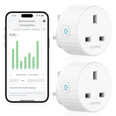 EIGHTREE Smart Plug with Energy Monitoring, Plugs that Work Alexa, Google Home, WiFi Socket Remote Control and Timer Function, 2.4GHz Wi Fi Only, 13A, 2 Pack