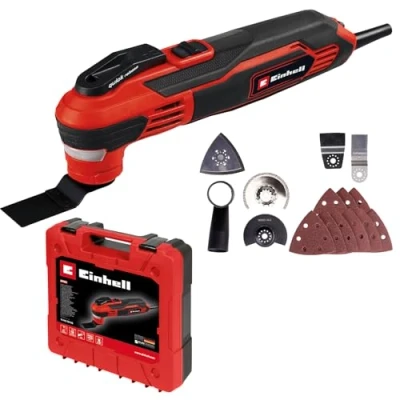VERSATILE 350W MULTI-FUNCTIONAL TOOL: Discover the power of the Einhell TE-MG 350 EQ, a compact 350W oscillating tool that effortlessly tackles a wide range of tasks around your home, workshop, and garage MASTER ANY JOB WITH PRECISION: From wood and plastic to metal and tile grouting, this oscillating multi-tool is your go-to solution for scraping, grinding, sawing, and more; delivering professional-level results every time TAILORED PERFORMANCE WITH SPEED CONTROL: Achieve optimal outcomes by customizing the tool's power to match the task at hand and the material you're working with, thanks to the convenient speed regulation feature COMFORTABLE AND EFFICIENT WORK: The tool's locking function-equipped switch ensures fatigue-free operation during extended projects. Plus, the quick release function simplifies accessory changes, keeping your workflow seamless MESS-FREE WORKSPACE, EFFORTLESS CLEANUP: Keep your workspace clean and tidy with the quick and tool-free mounting of the dust extraction device, allowing you to easily connect a suction device like a wet/dry vacuum cleaner for a dust-free environment, Weight: 2.8880556322 Pounds, Manufacturer: Einhell