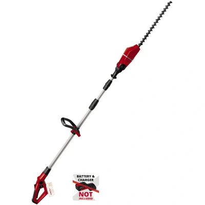 General description The rechargeable high-hedge trimmer GE-HH 18/45 Li T is a powerful device designed for the maintenance of hedges, shrubs, and bushes in large plots and allotment gardens. It features a metal gearbox for durability and laser-cut, diamond-grind steel knives for clean cutting results. Technical specifications Cutting Length: 40 cm Sword Length: 45 cm Teeth Spacing: 16 mm Battery: 1x 18V (not included) Compatibility and accessories Member of the Power X-Change family Battery and charger available separately Installation Adjustable and fixable aluminium telescopic handle Infinitely adjustable additional handle with quick-lock Usage Motor head can be tilted in 7 positions for vertical and horizontal cuts Main handle can be tilted in 4 positions for optimal adjustment Sturdy cutter guard for safe storage and transportation Includes carrying belt for easy transport