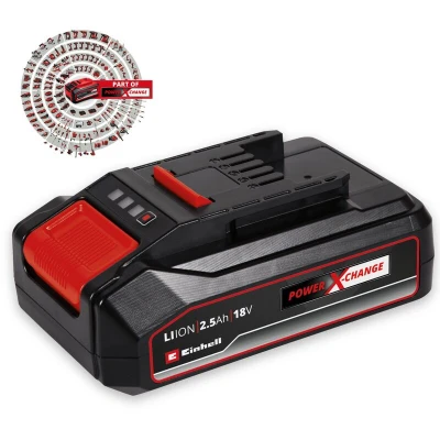 General description The Einhell 18V 2.5 Ah Power X-Change Battery is part of the multifunctional and interchangeable Power X-Change rechargeable battery system. This battery can be universally used to power all cordless tools from the entire garden and workshop product family, providing significant cost savings and environmental benefits by eliminating the need for multiple batteries and chargers. Technical specifications Voltage: 18V Capacity: 2.5 Ah Battery management system: ABS process-controlled with microprocessor Charge level indicator: 3-step LED display Other information Dust resistant housing Corrosion resistant Mechanical impact resistance Suitable for TWIN-PACK use for 36V applications Easy removal with trough handle