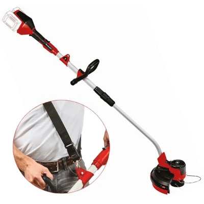 General description The Einhell GE-CT 36/30 Li-Solo Power X-Change Grass Trimmer is a powerful cordless tool designed for efficient garden maintenance. It operates on two 18V batteries (not supplied), providing the freedom to trim edges and shape lawns without the hassle of cords. The trimmer features electronic speed control for optimal performance and a cutting width of up to 30 centimeters, making it suitable for various trimming tasks. Technical specifications Power: 2 x 18 V batteries (required for operation) Cutting width: 30 cm Idle speed (max): 9000 min^-1 Line diameter: 2 mm Installation Easy assembly with a split shaft for convenient transport and storage. Usage Ideal for trimming edge strips and maintaining lawn shape. Features an automatic jog system for easy line feeding. Equipped with a Flower Guard to protect flowers and ornamental plants. Other information Includes a shaped long aluminum handle for reduced fatigue. Adjustable additional handle with quick-release lock