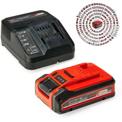 General description The Einhell 4 Ah PLUS Starter Kit is an essential foundation for starting or expanding your domestic Power X-Change range. This kit includes an 18 V 4 Ah Power X-Change battery and a 3 A quick charger, designed to work seamlessly with all cordless tools in the Power X-Change family, providing power and endurance for both garden and workshop applications. The universal nature of this system not only reduces costs but also minimizes environmental impact by eliminating the need for multiple batteries and chargers. Technical specifications Battery voltage: 18 V Battery capacity: 4 Ah Charger output: 3 A Battery type: Li-ion Weight: 10% lighter than previous models Compact design: 13% more compact than standard batteries Compatibility and accessories Compatible with all Einhell Power X-Change DIY and garden tools Suitable for TWIN-PACK use in 36 V applications Installation Charger can be easily mounted on the wall using integrated hanging slots Usage Fast charging