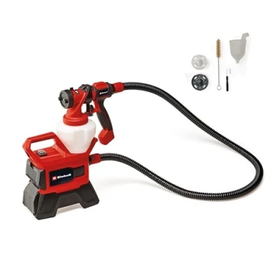 EXPERIENCE CORDLESS FREEDOM: Annoying Power Cords Are A Thing Of The Past! This battery-powered, hand-held spray gun system offers fast, even and accurate spraying of varnishes, lacquers, glazes and washing agents without the need for a power supply SIMPLE AND EASY TO USE: Sprays up to 1000ml/ minute with the amount of paint applied being infinitely adjustable. The adjustable air cap (vertical, horizontal or round jets) means that the Spray can be tailored to the surface being treated A COMPLETE SPRAY PAINTING SYSTEM - Supplied with a large capacity 1200ml paint tub with measuring scale, a cleaning brush and a cleaning pin for cleaning the spray nozzle. The spray gun is supplied with 3 nozzles making it suitable for a variety of lacquers and glazes ONE BATTERY FOR OVER 300 TOOLS: Our intelligent ABS Battery Electronics and high-performance Li-Ion Cells make The Power X-Change rechargeable battery system one of the safest in the industry. With compatibility across a wide range of tools, you can power up more than 300 devices with a single battery CORDLESS PAINT SPRAY SYSTEM ONLY: Please note that this listing is for the battery-powered electric spray gun and tank with accessories. It requires 1 x 18v Lithium-ion rechargeable battery and charger (Sold Separately), Weight: 6.0406659788 pounds, Manufacturer: Einhell
