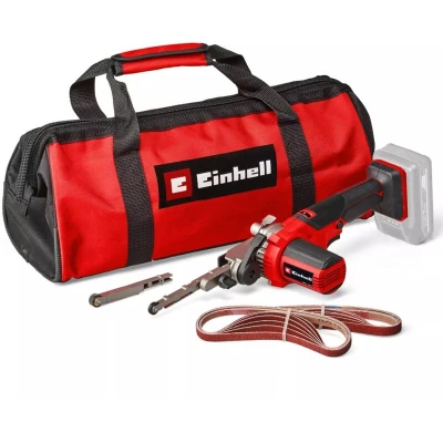 General description The Einhell TE-BF 18 Li-solo Power X-Change Belt File is a versatile and handy tool designed for grinding and deburring in hard-to-reach areas. It features a narrow 9mm grinding arm for intricate work and a wider 13mm grinding arm for larger, flat surfaces. The grinding arm can pivot up to 90°, providing flexibility for various working positions. Technical specifications Battery: 1x 18 V (not included) Speed range: 250 to 1,700 m/min Grinding arms: 2 (9mm and 13mm) Included sanding belts: 12 pieces (6 x 457 x 9mm and 6 x 457 x 13mm in P60, P80, P120 grit) Weight: Lightweight design for easy handling Compatibility and accessories Extraction adapter compatible with Einhell wet/dry vacuums Includes practical transport and storage case Installation Tool-free changes of grinding belt Belt tracking adjustment via screw on the sanding arm Usage Ideal for grinding and deburring hard-to-reach areas Variable speed control allows adaptation to different materials Lock-on