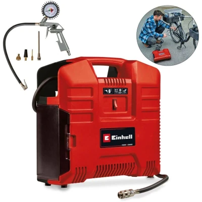 General description The Einhell TE-AC 36/8 Li OF Set-Solo battery pack compressor is a compact yet powerful tool from the Power X-Change family, designed for various applications requiring compressed air up to a maximum of 8 bar. It is ideal for quickly inflating bicycle, car, and motorcycle tires, including demanding road bike tires, thanks to its efficient pump. The ergonomic design and practical handle enhance mobility and ease of transport, making it a convenient choice for on-the-go tasks. Technical specifications Maximum pressure: 8 bar Power source: Requires 2x 18 V Power X-Change batteries (not included) Compressor type: Oil-free, service-free pump Hose length: 2.50 meters Compatibility and accessories Compatible with all members of the Power X-Change family Includes a 2.50-meter compressed air hose with quick coupling Comes with a tyre inflation gauge and a three-piece adapter set Features an additional storage box for adapters Usage Ideal for inflating bicycle, car, and