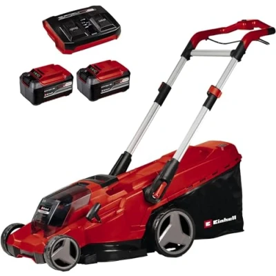 EXPERIENCE LAWNMOWER CORDLESS FREEDOM - Annoying power cords are a thing of the past! Thanks to the longer running times from the 36V batteries in our RASARRO range of lawn mowers cordless technology makes taking care of every area of your lawn a real pleasure 2-IN-1 BLOWER & VAC - The brushless motor provides exceptional suction (max. 500m³/h) then simply flick the switch to unleash 210 km/h of leaf blowing power. With its electronic speed control, suction and blowing power are individually adjusted so only the debris is removed GERMAN DESIGN EXCELLENCE - The cordless walk-behind lawn-mower has 6 cutting heights (25mm to 75mm), an adjustable long handle that folds away for easy storage and a generously dimensioned 50L grass box with fill level indicator. With a cutting width of 38cm it effortlessly tackles medium to large lawns up to 725 m² ONE BATTERY FOR OVER 300 TOOLS - The same battery will power all of your Einhell PXC Power Tools and Garden Machines. Our intelligent ABS Battery Electronics and high-performance Li-Ion Cells makes our rechargeable battery system one of the safest in the industry and ensures efficiency, reliability and durability RECHARGEABLE LAWNMOWER WITH BATTERIES AND CHARGER - This is a Cordless Lawn Mower kit and includes 2 x 4Ah 18V lithium-ion rechargeable batteries and charger, Weight: 37.9856477426 pounds, Manufacturer: Einhell