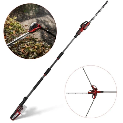 The Einhell Professional cordless telescopic hedge trimmer GP-HH 18/50 Li T BL-Solo is a reliable tool for the regular care of tall hedges and shrubs. The compact pole hedge trimmer is a member of the Einhell Power X‑Change family and can be combined with all batteries and chargers from the system series. The tool is driven by an Einhell Brushless motor. This brushless motor provides more power and longer running times than a conventional carbon brush motor. Once you register online, there is a 10-year warranty on the Brushless motor. The telescopic pole can be adjusted without tools for an entire tool length between 220 and 290 cm and has handy soft-grip holding surfaces. The cutting head is 8-way tiltable and equipped with laser- and diamond-cut blades made of steel with a cutting length of 50 cm and a tooth spacing of 25 mm. The robust metal gearbox is designed for a long service life. For safe transportation and storage of the long pole hedge trimmer, a protective case is included