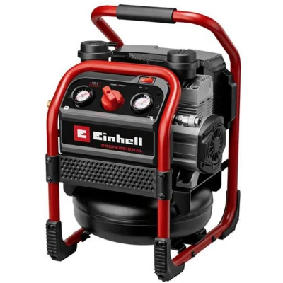 The Einhell SILENZZO 18/160 PROFESSIONAL Air Compressor is an ideal helper for compressed air work around the house, workshop and garage. This powerful cordless compressor is equipped with a 6-litre tank and generates up to 8 bar of working pressure. It works with an intake capacity of maximum 160 litres per minute and a discharge capacity of up to 95 l/minute. Its oil-free and service-free pump requires little service effort or maintenance. Despite its high performance, the mobile cordless compressor SILENZZO works particularly quietly and produces hardly any noise due to its rubberised and low-vibration positioned feet. A pressure gauge is available for the regulated working pressure as well as for the boiler pressure. The compressor is also equipped with a quick coupler, which therefore enables quick and easy connection of compressed air or pneumatic tools. The desired working pressure can be set manually by means of the pressure regulator. For convenient maintenance, the cordless